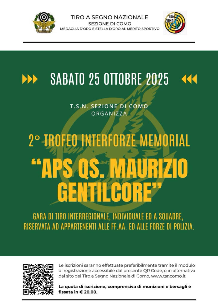 Sabato 25 ottobre il Tiro a segno nazionale di Como organizza il secondo Trofeo interforze memorial Maurizio Gentilcore, riservato gli appartenenti alle forze armate e di polizia. Sono previsti quattro esercizi, da svolgere con la pistola d’ordinanza (munizioni fornite dall’organizzazione), con distanze di tiro variabili tra i 12,5 e i 25 metri. Per iscrizioni è possibile andare sul link QUI.