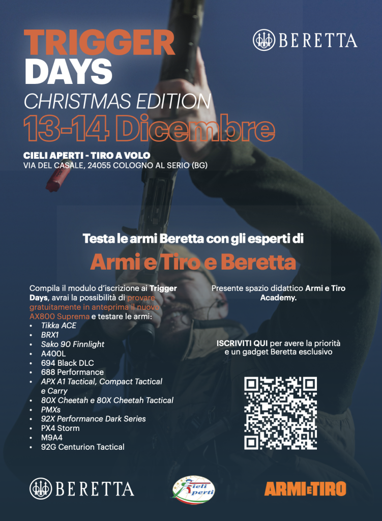 Il 13 e 14 dicembre, tornano i Trigger days Beretta, questa volta al poligono Cieli aperti di Cologno al Serio (Bg). L’evento, in collaborazione con la redazione di Armi e Tiro, che proporrà una edizione “live” delle sue academy per tutti i partecipanti, consentirà di provare gratuitamente al tiro, a chiunque sia in possesso di un porto d’armi in corso di validità, il nuovissimo fucile da caccia AX800 Suprema, tutti i modelli più recenti di armi corte (Apx A1 tactical compact Tactical e Carry, 80X e 80X Tactical, 92X performance Dark series, Px4 Storm, M9A4, Pmxs, 92G Centurion tactical), di armi lunghe a canna rigata (Beretta Brx1, Sako 90 Finnlight, Tikka T3x Ace) e di fucili a canna liscia (A400L, 694 Black Dlc, 688 Performance) del gruppo.